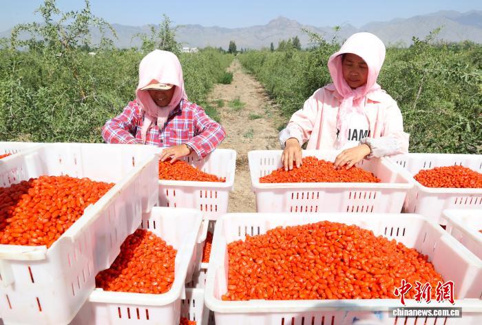 资料图为宁夏某狼养殖基地,农民正在分拣新鲜采摘的狼果。中新社记者 于静 摄